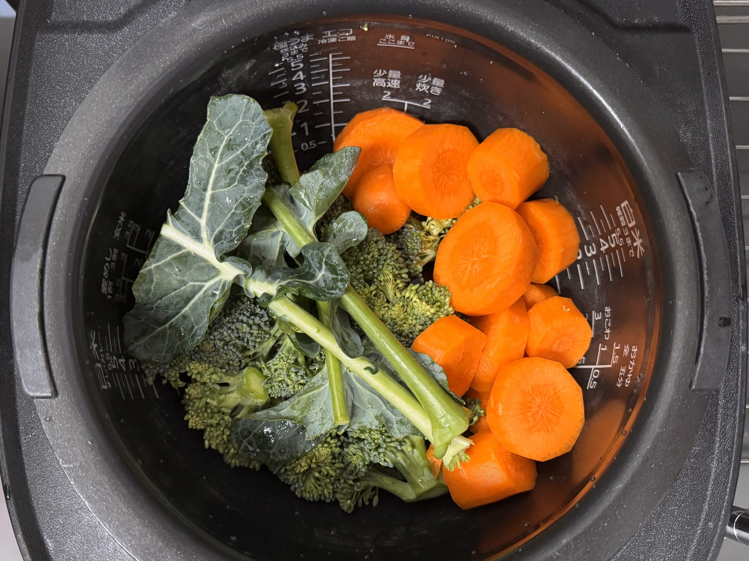 お鍋で茹でると、野菜の旨味成分やビタミンが「ゆで汁」の中にどんどん逃げ出してしまいます(これを溶出といいます)。炊飯器の場合は、 使う水が少量で済むため、野菜が水に浸かりすぎず、「野菜自身の水分で蒸される」ような状態になります。これにより、旨味がギュッと凝縮され、野菜本来の濃い味を感じられるようになります。