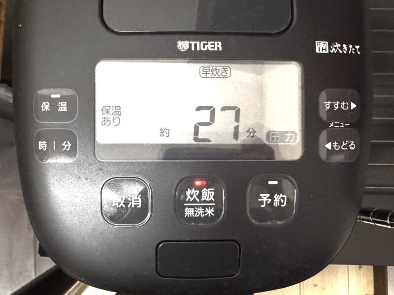 炊飯器の「炊飯」スイッチを押して加熱を開始します。調理目安時間は「15分」です。通常モードや早炊きモードで調理する場合は、設定時間が15分を超える場合があります。その時は「取消」を押して、加熱を中止してください。調理モードの場合で時間が指定できる場合は、15分で調理してみてください。上記の時間で調理をしてみても野菜の火の通りが足りない場合は、「保温」で数分間放置すると、じっくり中まで火が通ります。