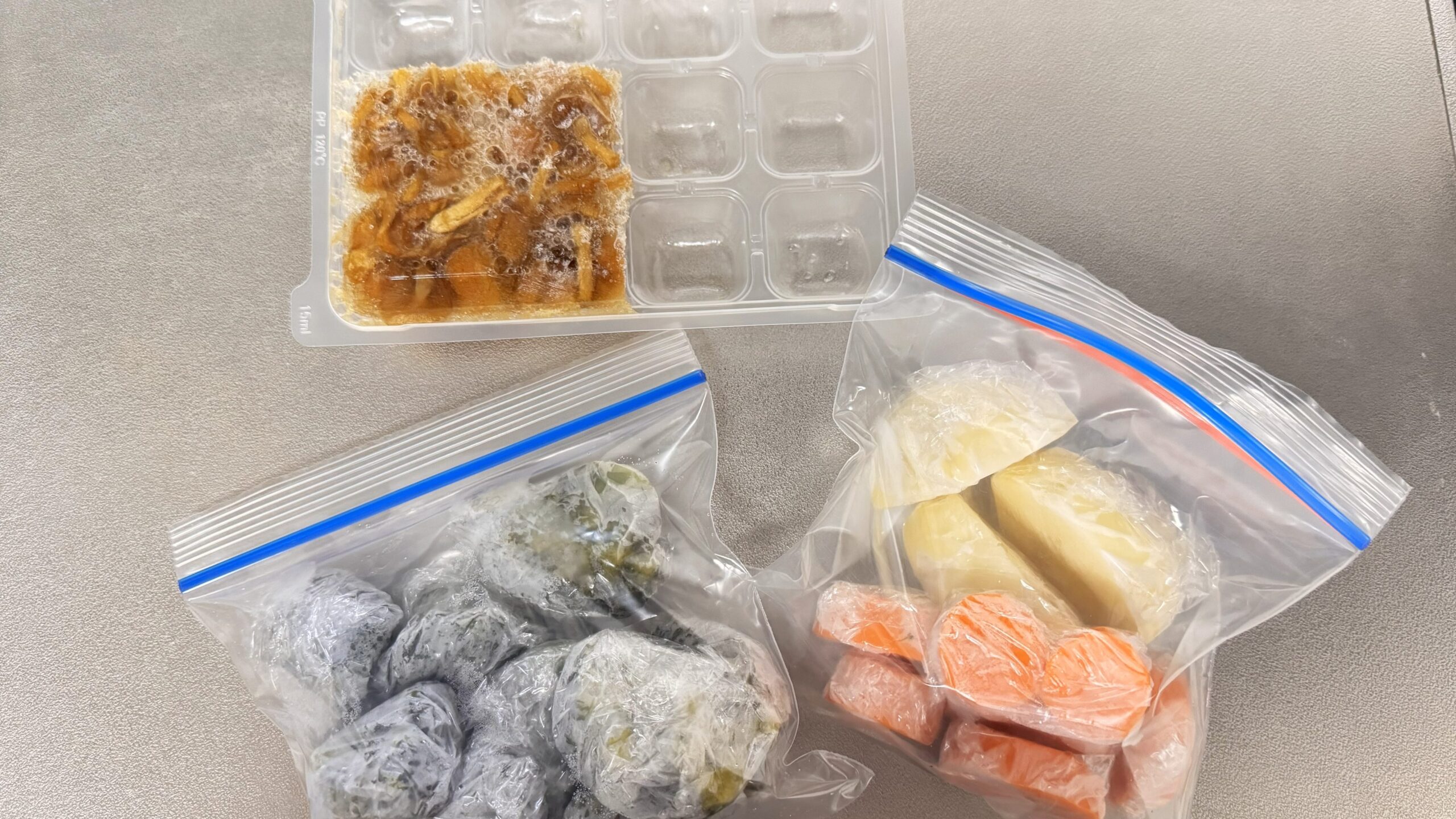 炊飯器で加熱調理した野菜を冷凍で保存します。「野菜貯金」のポイントは使いやすいグラム単位で「小分け」して保存することです。わたしはラップで包んで小分けにすることが多いです。細かくカットしている野菜は、子供の離乳食で使用した小分け容器を使用して冷凍しています。これは製氷皿でも代用できるのでおすすめです。使う時はレンジでチン、または凍ったままスープや味噌汁にポン!一度炊飯器で加熱しているので、食べられる程度に加熱ができればOKです。